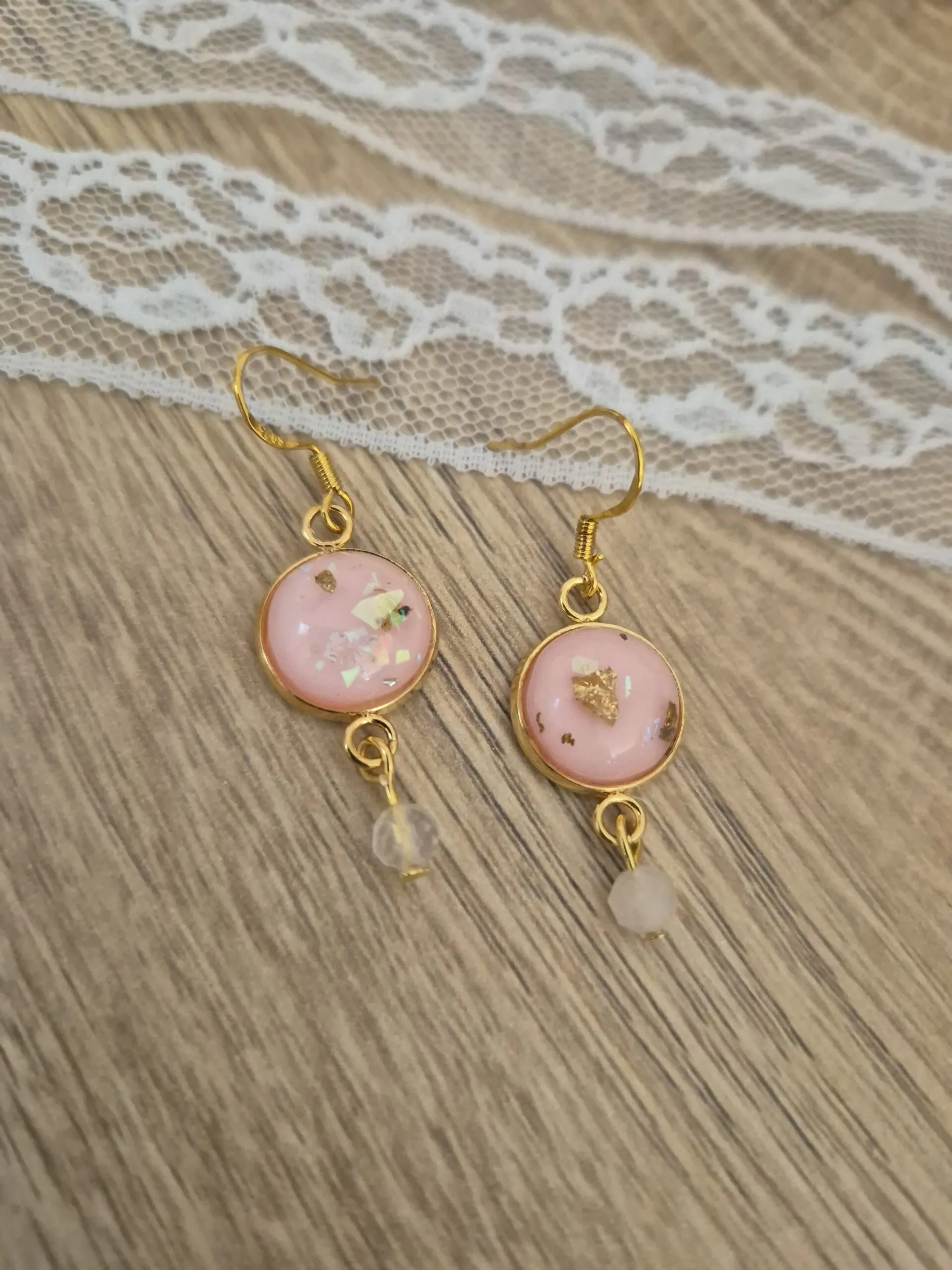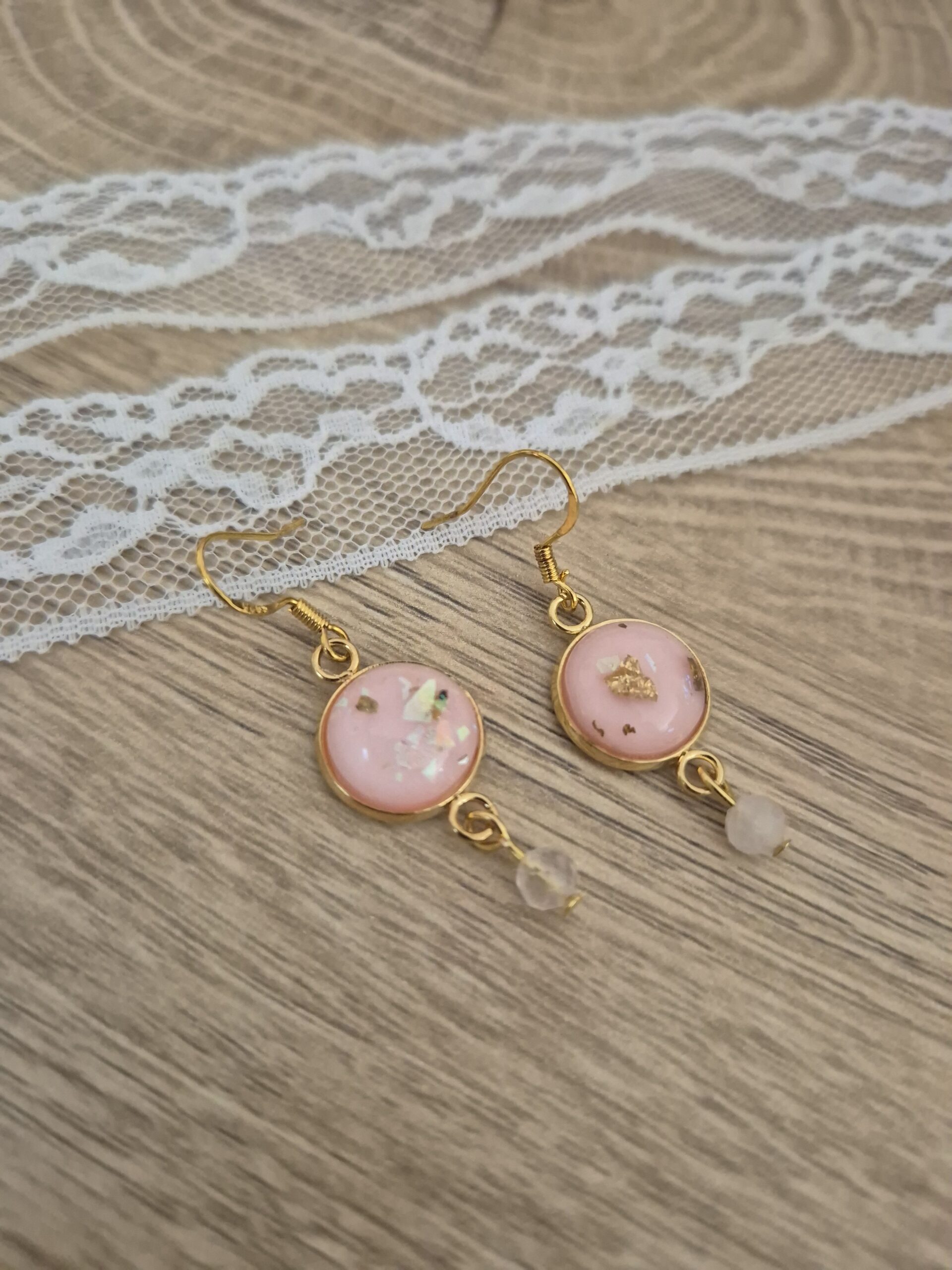 ✨ Boucles d’oreilles dorées en quartz rose et résine feuille d’or