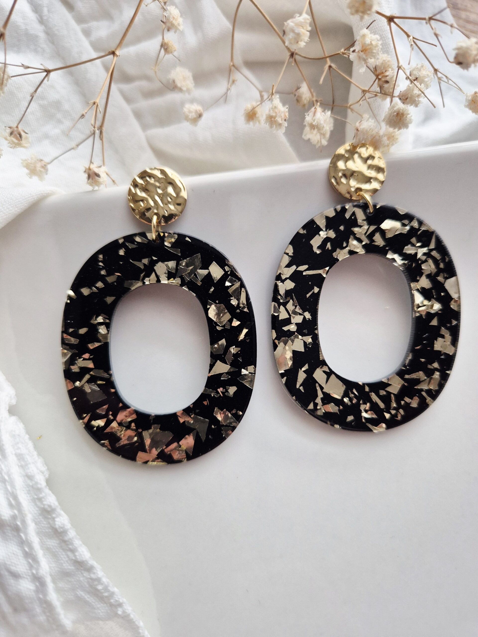 Laissez-vous séduire par ces boucles d’oreilles au charme profond et raffiné. Leur anneau noir intense, délicatement parsemé d’éclats dorés, capte la lumière à chaque mouvement pour illuminer votre visage avec subtilité.