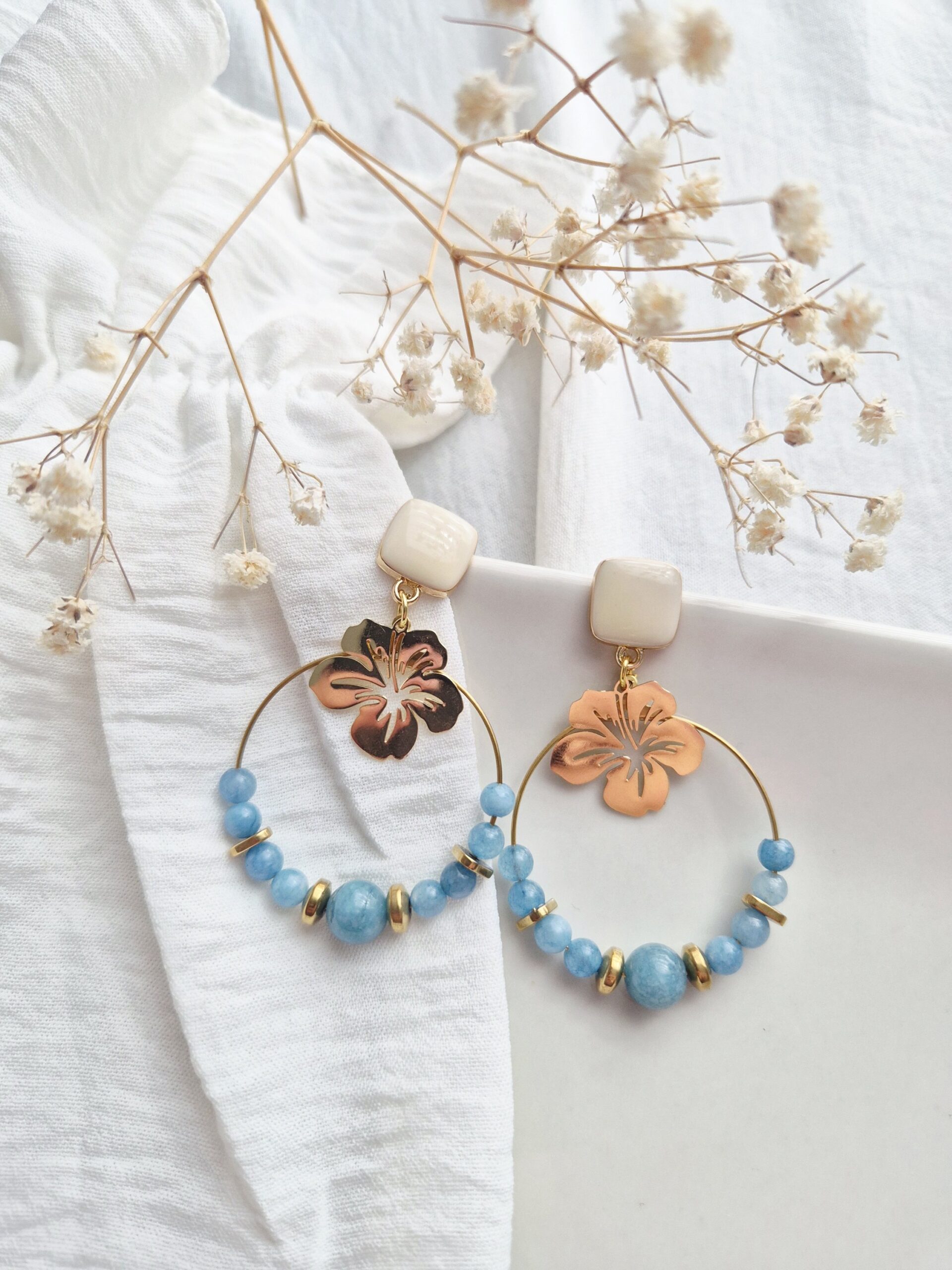 Ces boucles d’oreilles faites main allient la finesse du dorĂ© Ă  la fraĂźcheur de pierres naturelles bleutĂ©es, pour un bijou Ă  la fois lumineux, fĂ©minin et apaisant. La fleur d’hibiscus, dĂ©licatement ajourĂ©e, Ă©voque la lĂ©gĂšretĂ©, la beautĂ© naturelle et la douceur de vivre.