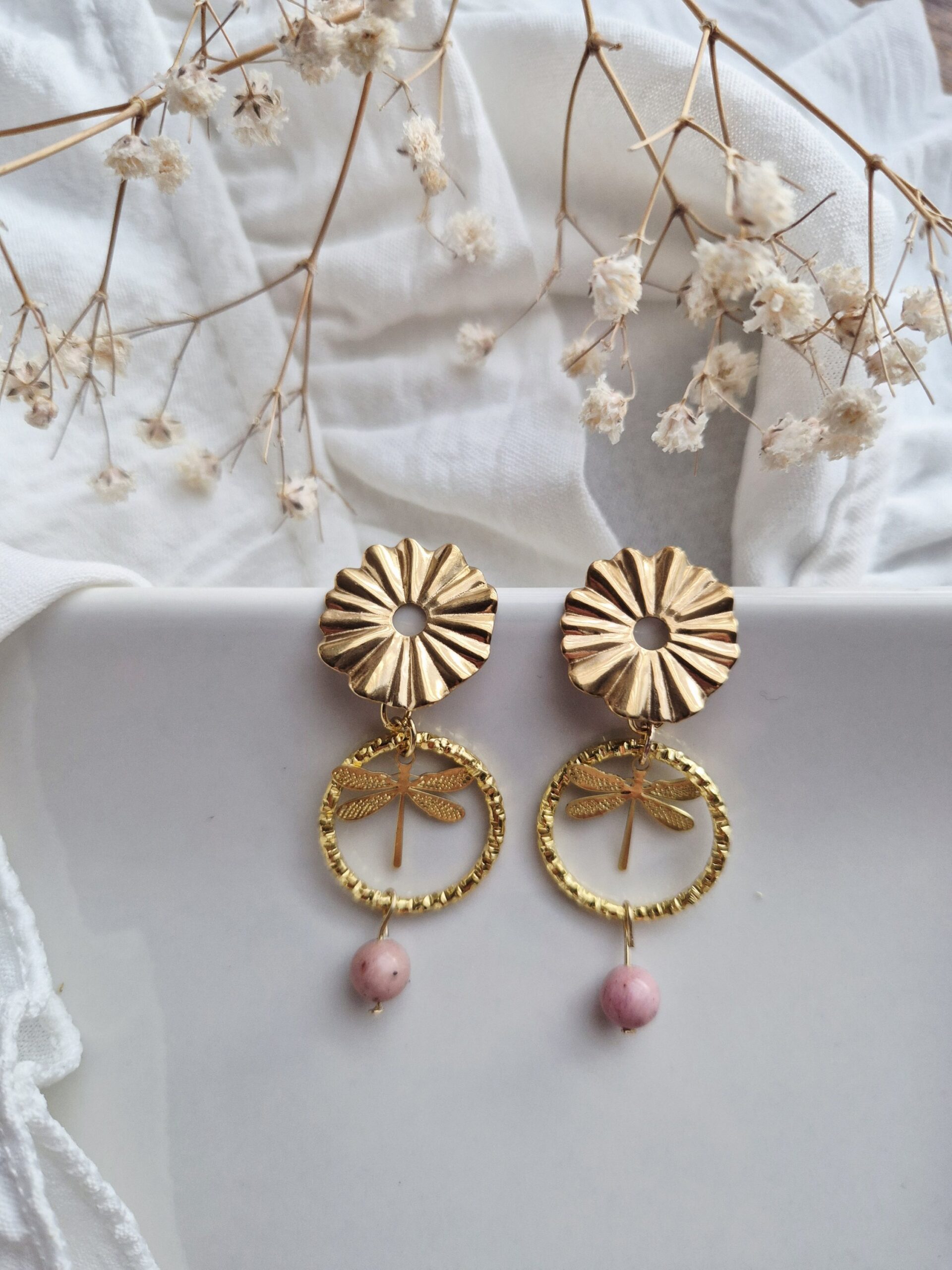 Ces boucles dâoreilles mettent Ă lâhonneur une fine libellule dorĂ©e, symbole de transformation et de douceur, dĂ©licatement suspendue dans un anneau texturĂ©.