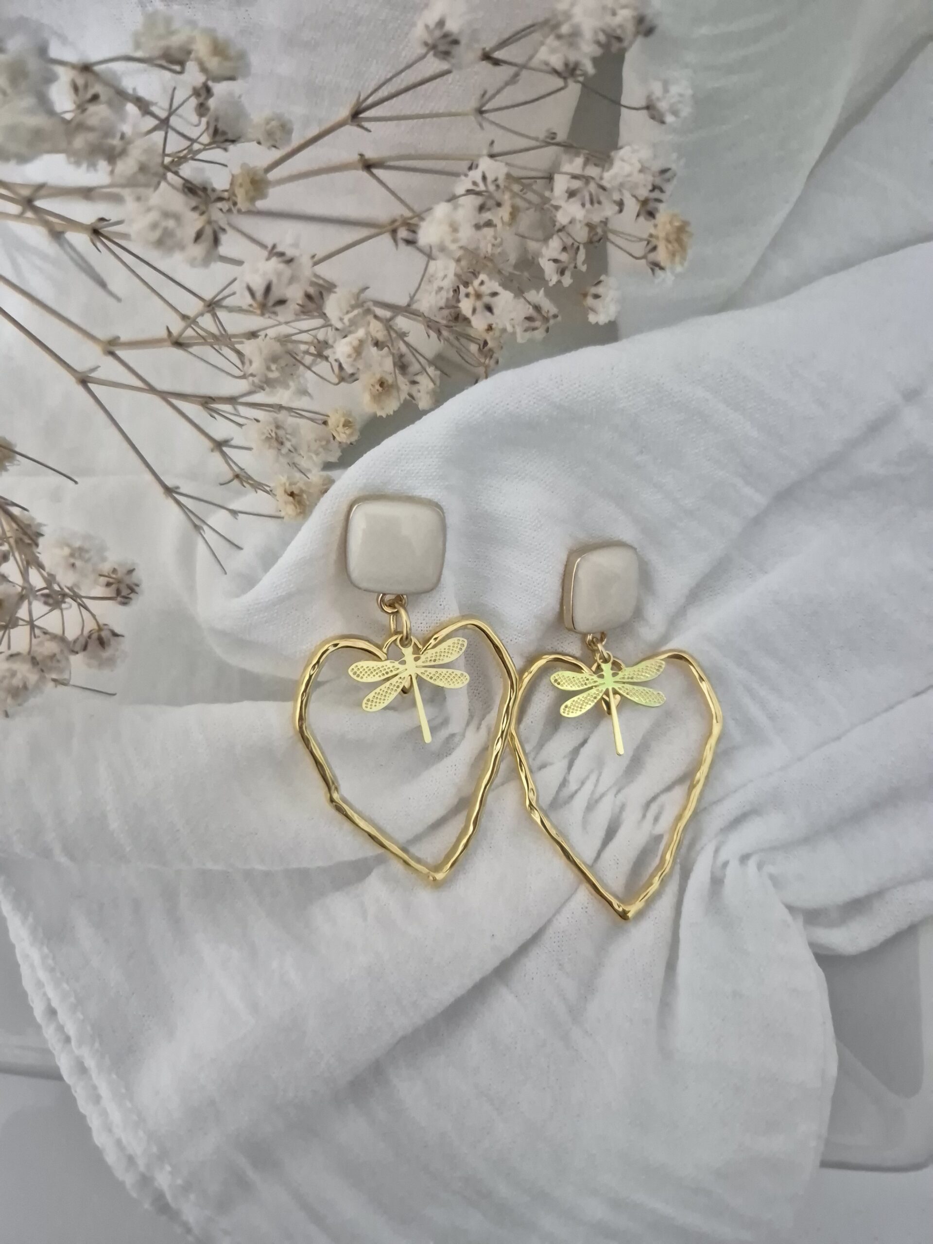 Leur design associe un pendentif en forme de cœur doré à une délicate libellule ciselée, symbole de légèreté et de liberté. Montées sur un fermoir carré nacré, elles apportent une touche de chic intemporel à toutes vos tenues.