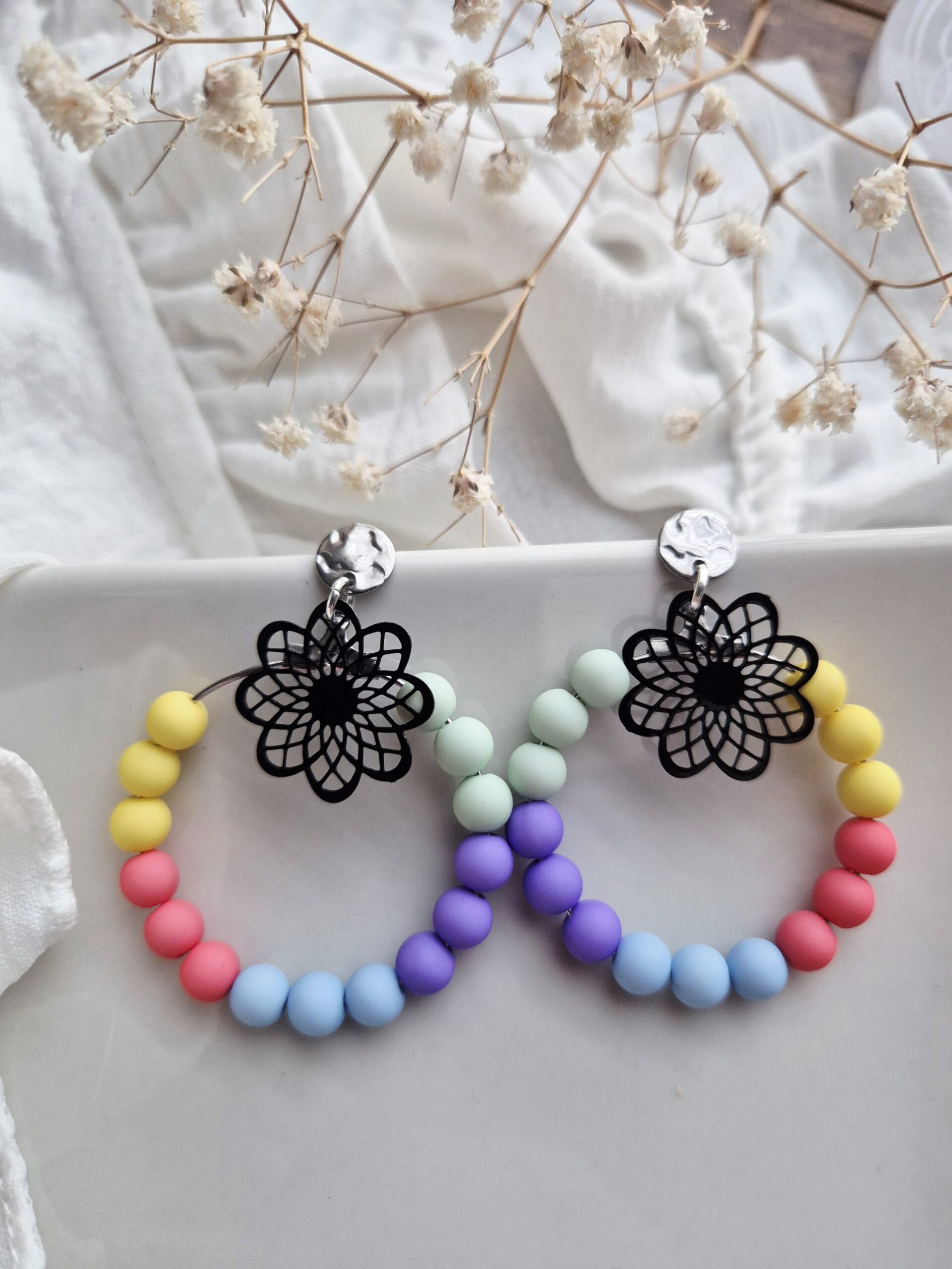 Les boucles d’oreilles Éclat Pastel illuminent ton visage avec leurs teintes douces et lumineuses, comme une promenade au printemps 🌼