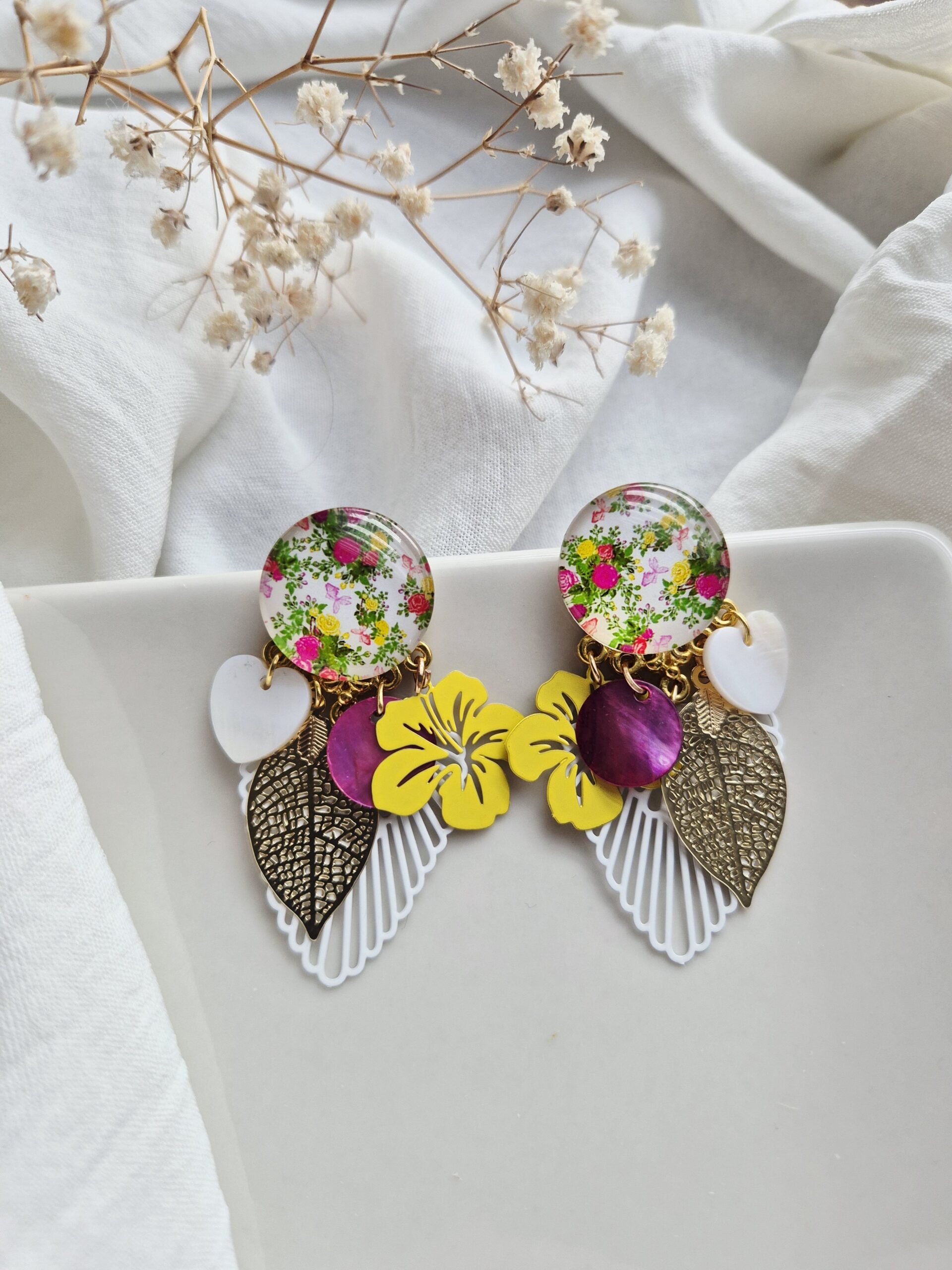 Ces boucles d’oreilles artisanales associent des motifs floraux délicats, une fleur d’hibiscus éclatante et de magnifiques pampilles dorées finement travaillées. Leur composition légère crée un mouvement élégant qui illumine le visage.