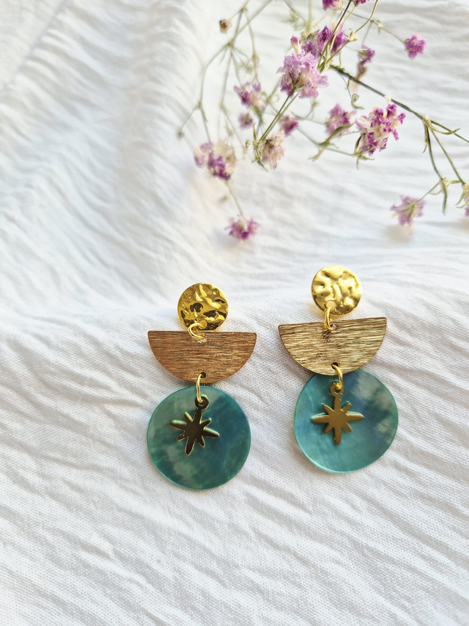 Le contraste entre le doré martelé et la nacre turquoise apporte une touche à la fois douce et solaire à ton look.