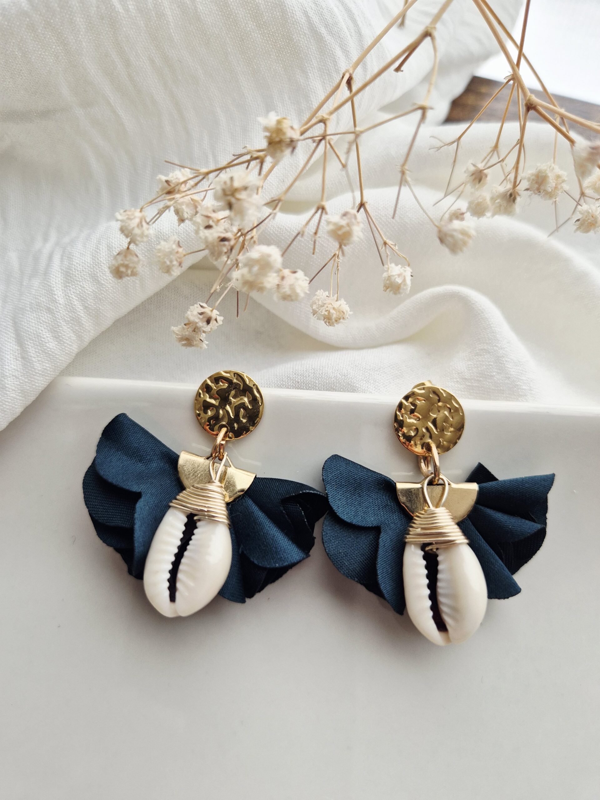 Leur coquillage naturel, sublimé par un travail doré et un délicat tissu bleu profond, apporte une touche à la fois élégante et solaire.