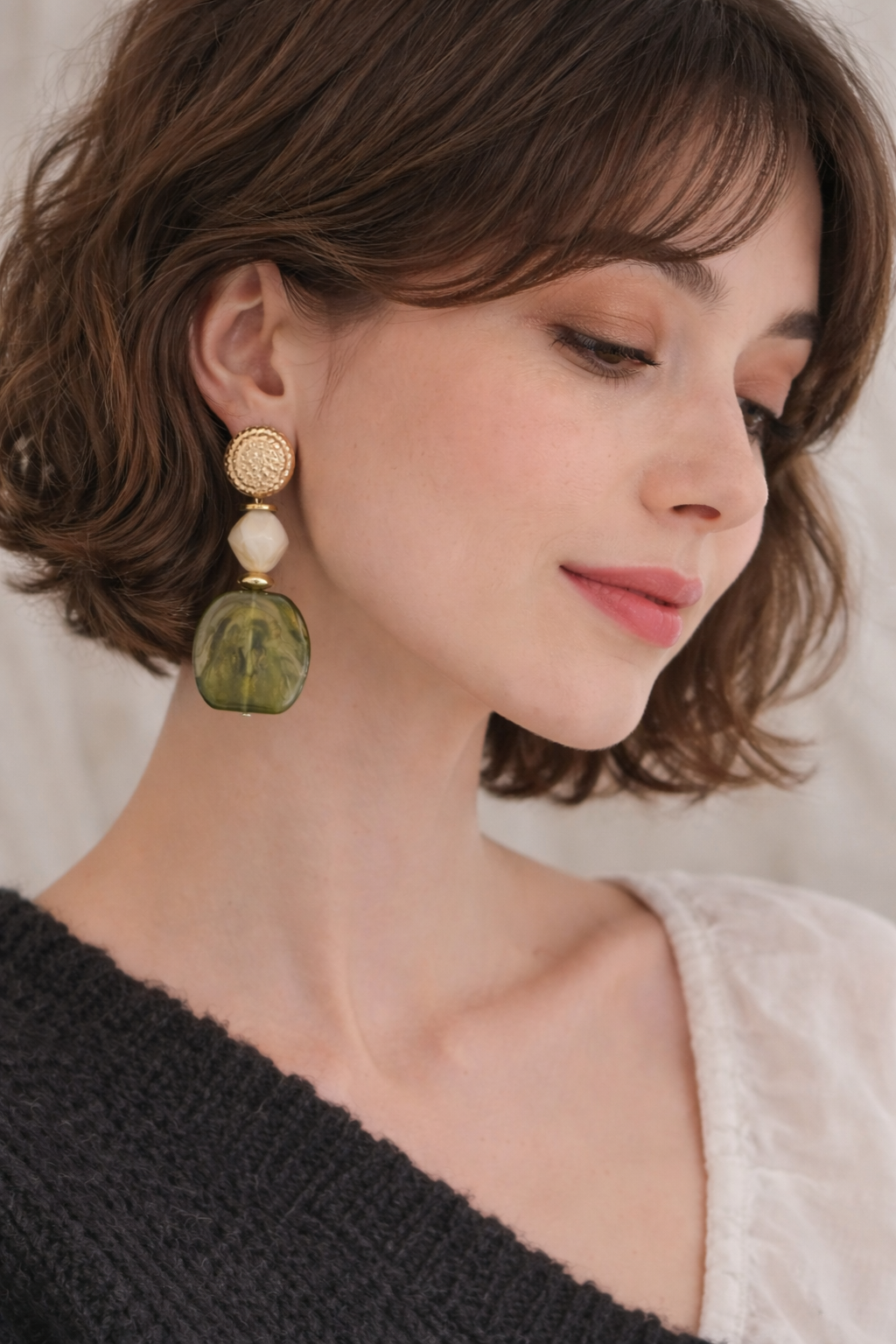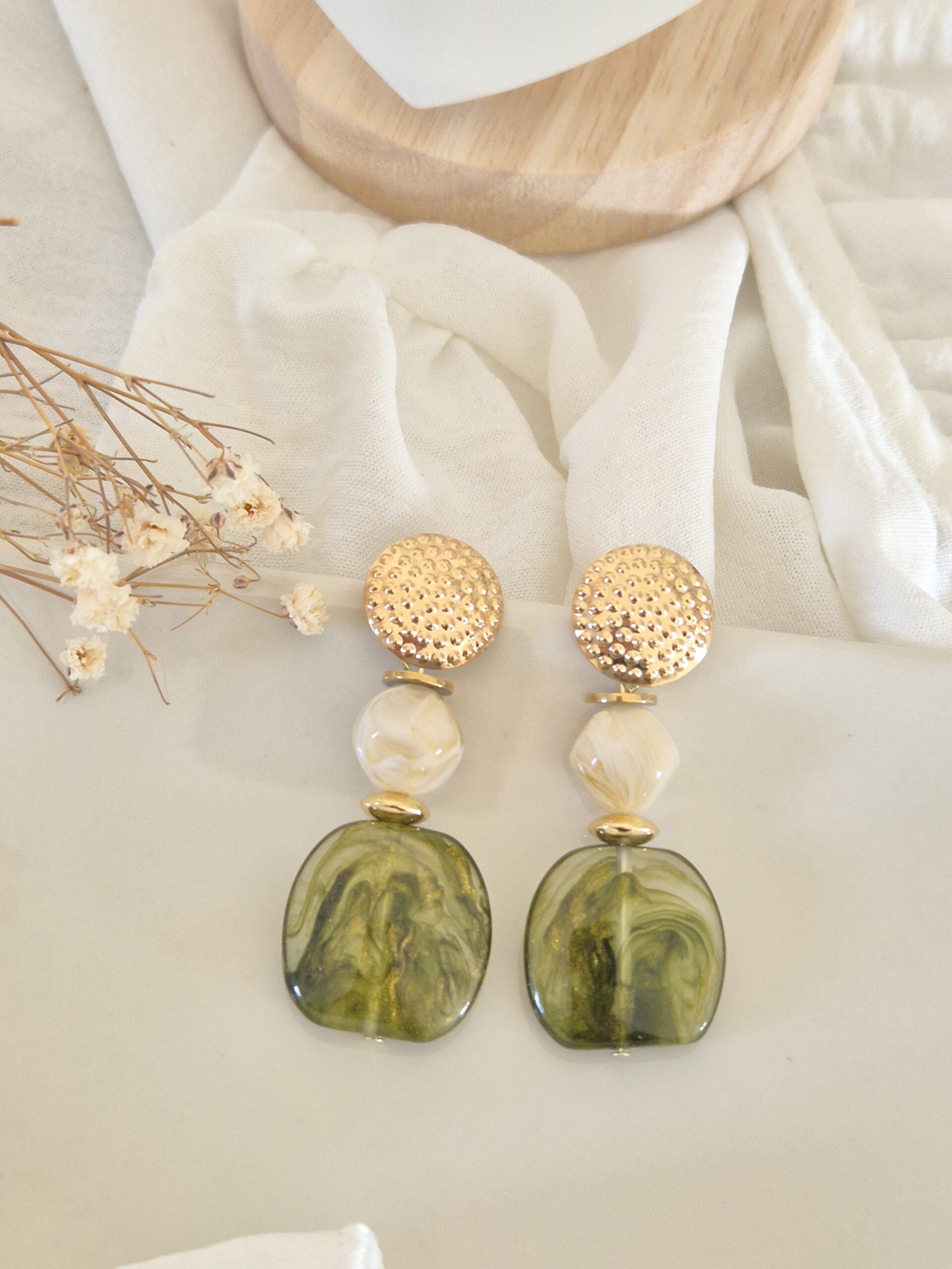 Elles se composent d’un clou rond doré texturé, d’une perle ivoire lumineuse et d’un pendentif vert marbré aux nuances profondes, pour un rendu à la fois doux, original et raffiné.