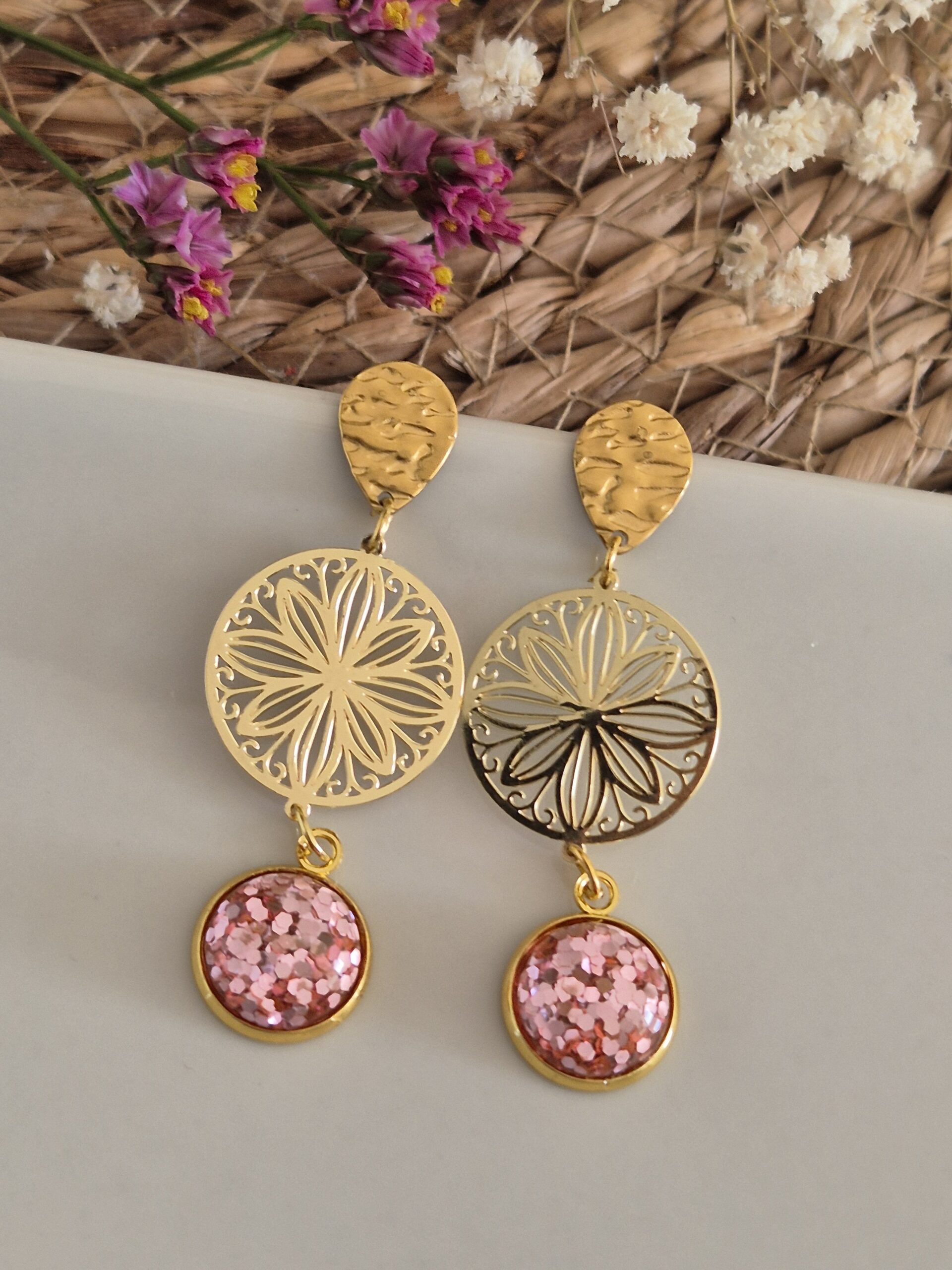 Leur design associe un médaillon doré finement ajouré à un pendentif scintillant aux reflets rose poudré — un duo parfait entre délicatesse et féminité.