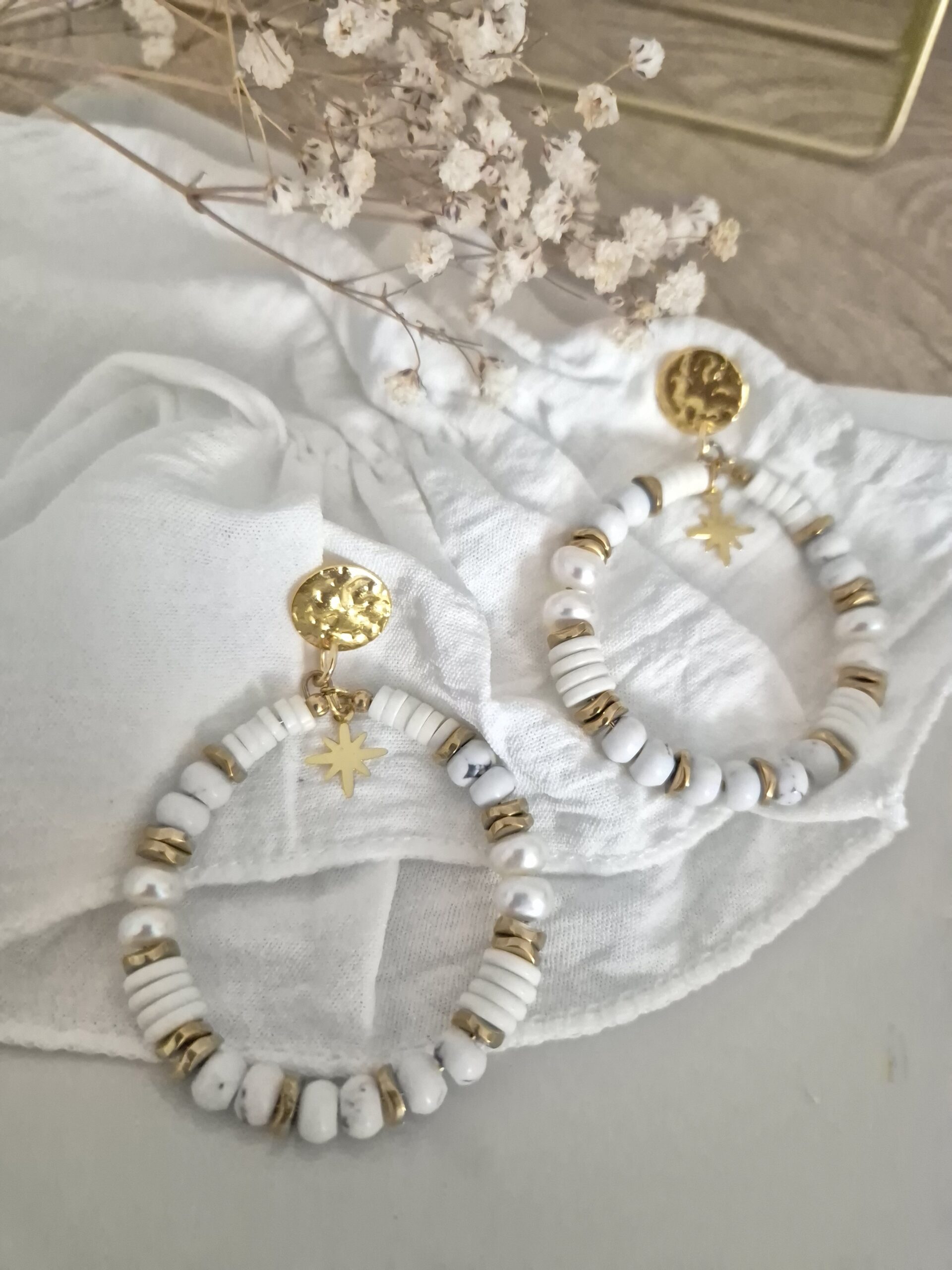 Apportez une touche de fraîcheur et d’élégance à vos tenues avec ces boucles d’oreilles raffinées. Composées de perles heishi délicates et d’howlite envoûtante, elles sont sublimées par des accents dorés qui captent la lumière avec chaque mouvement. L’association du blanc pur et du doré crée un équilibre parfait entre modernité et simplicité, tandis que la longueur de 7 cm assure un joli mouvement.