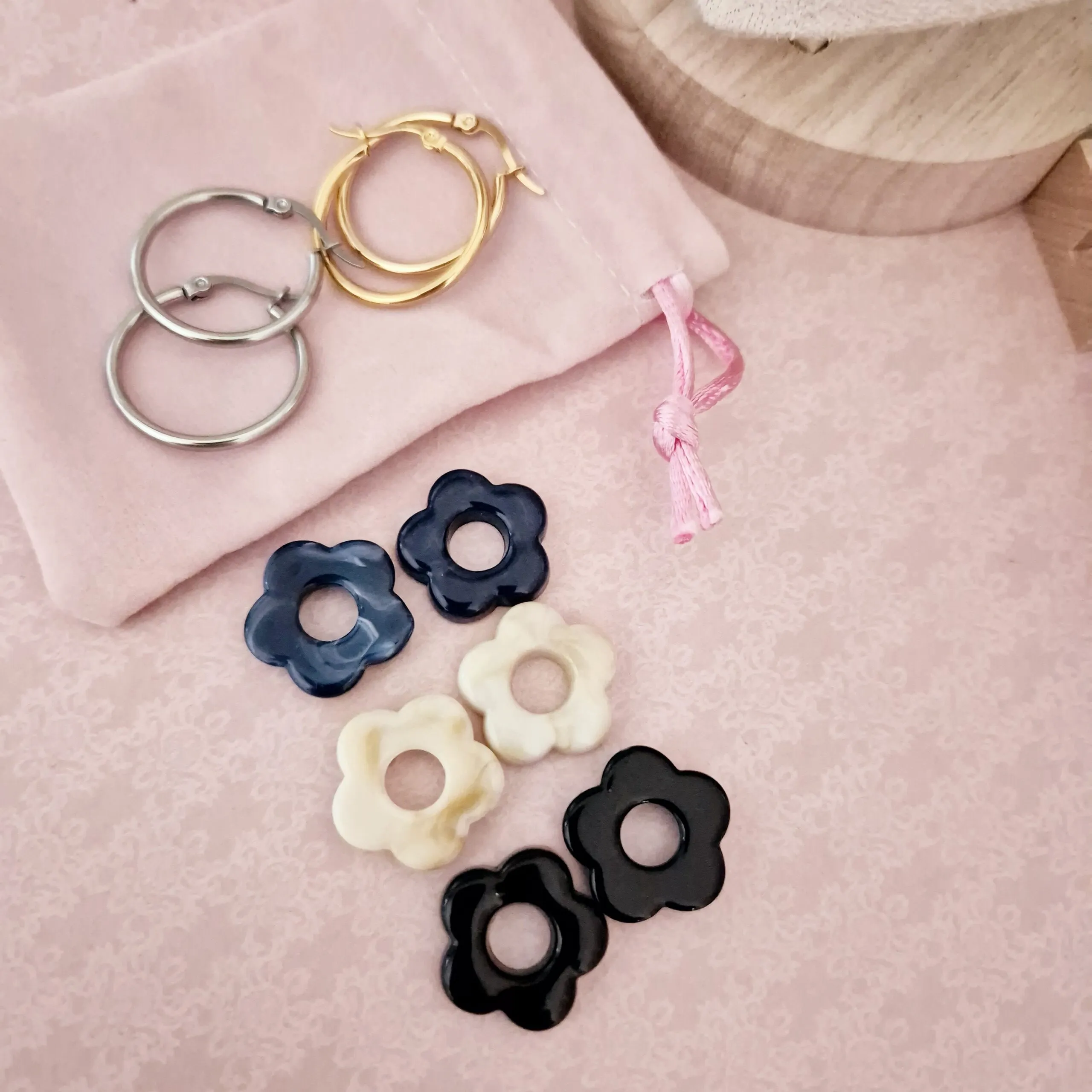 craquer pour une petite box avec la paire de créole en acier inoxydable taille 25 mm en argenté ou en doré ainsi que trois paires de pampilles en résine que vous pourrez interchanger à votre convenance en fonction de vos tenues