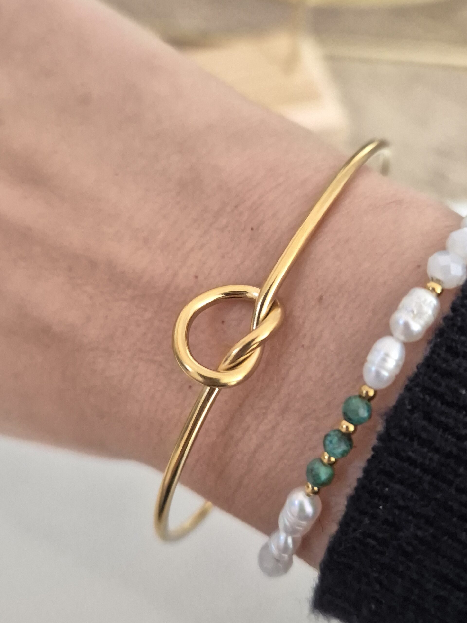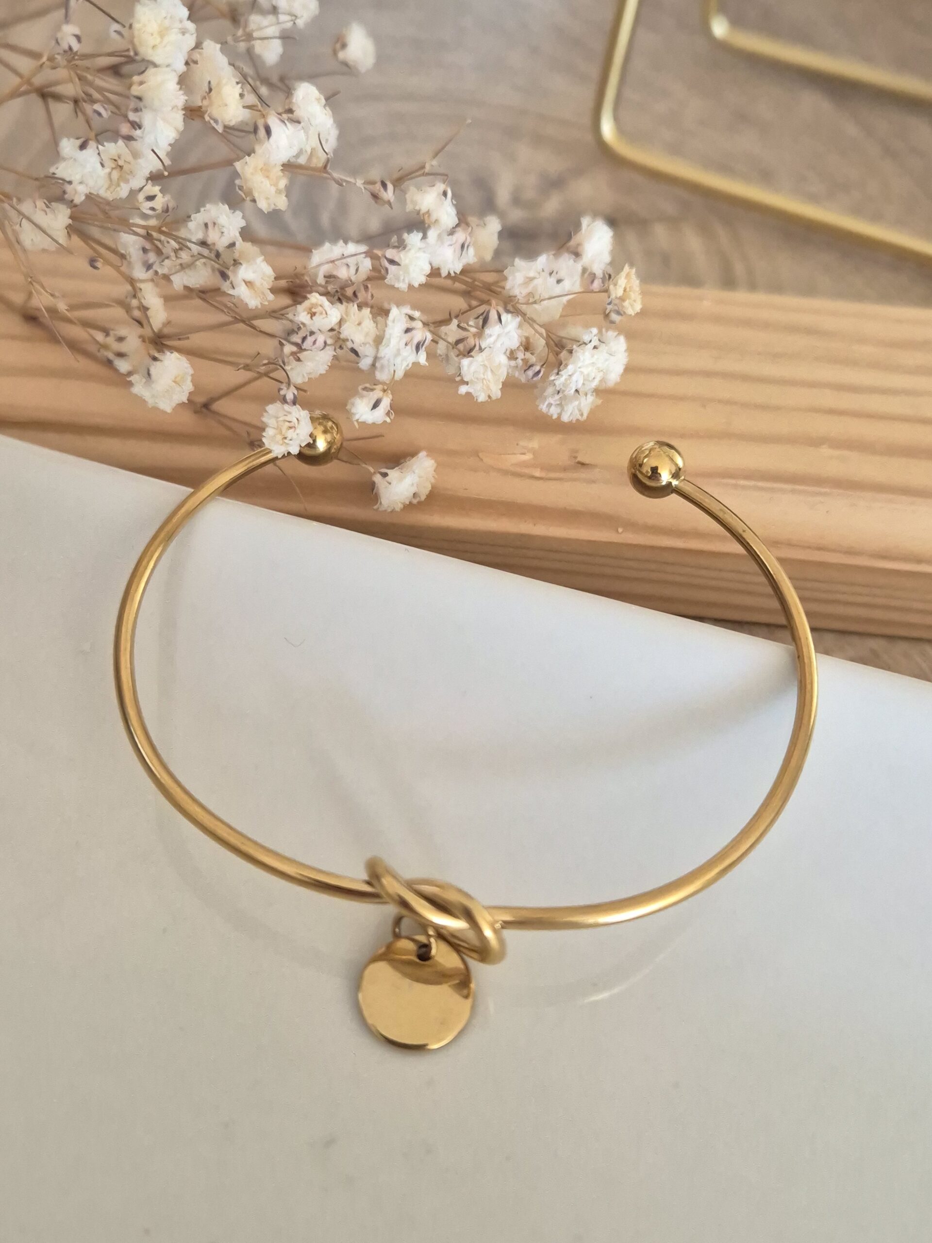 magnifique bracelet représentant un nœud en acier inoxydable doré resserrable à la taille de votre poignet en option vous avez la possibilité d’ajouter une petite médaille gravée de taille 10 mm