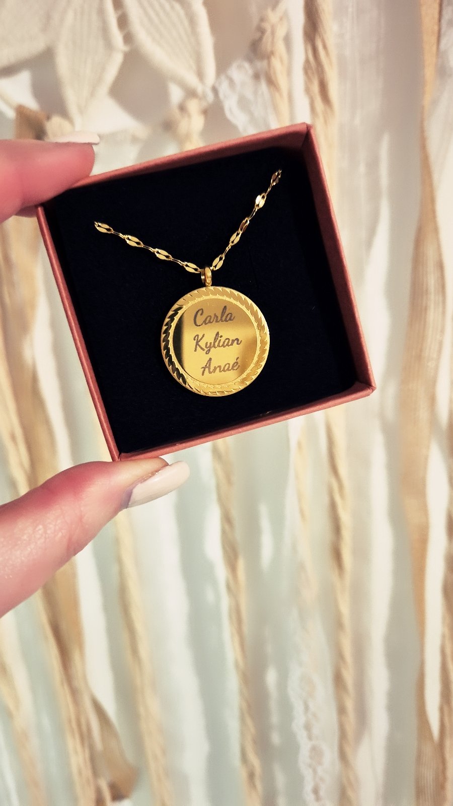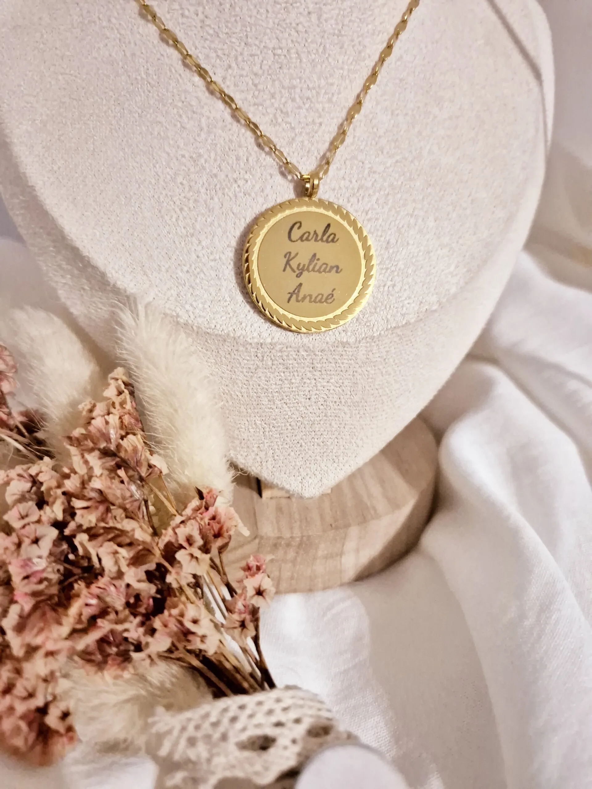 Ajoutez une touche de personnalité et d’élégance à votre style avec ce collier gravé sur mesure. Composé d’une estampe ronde martelée de 25mm, d’une médaille à personnalisée en gravure laser, ce bijou est l’expression parfaite de l’originalité et du raffinement.