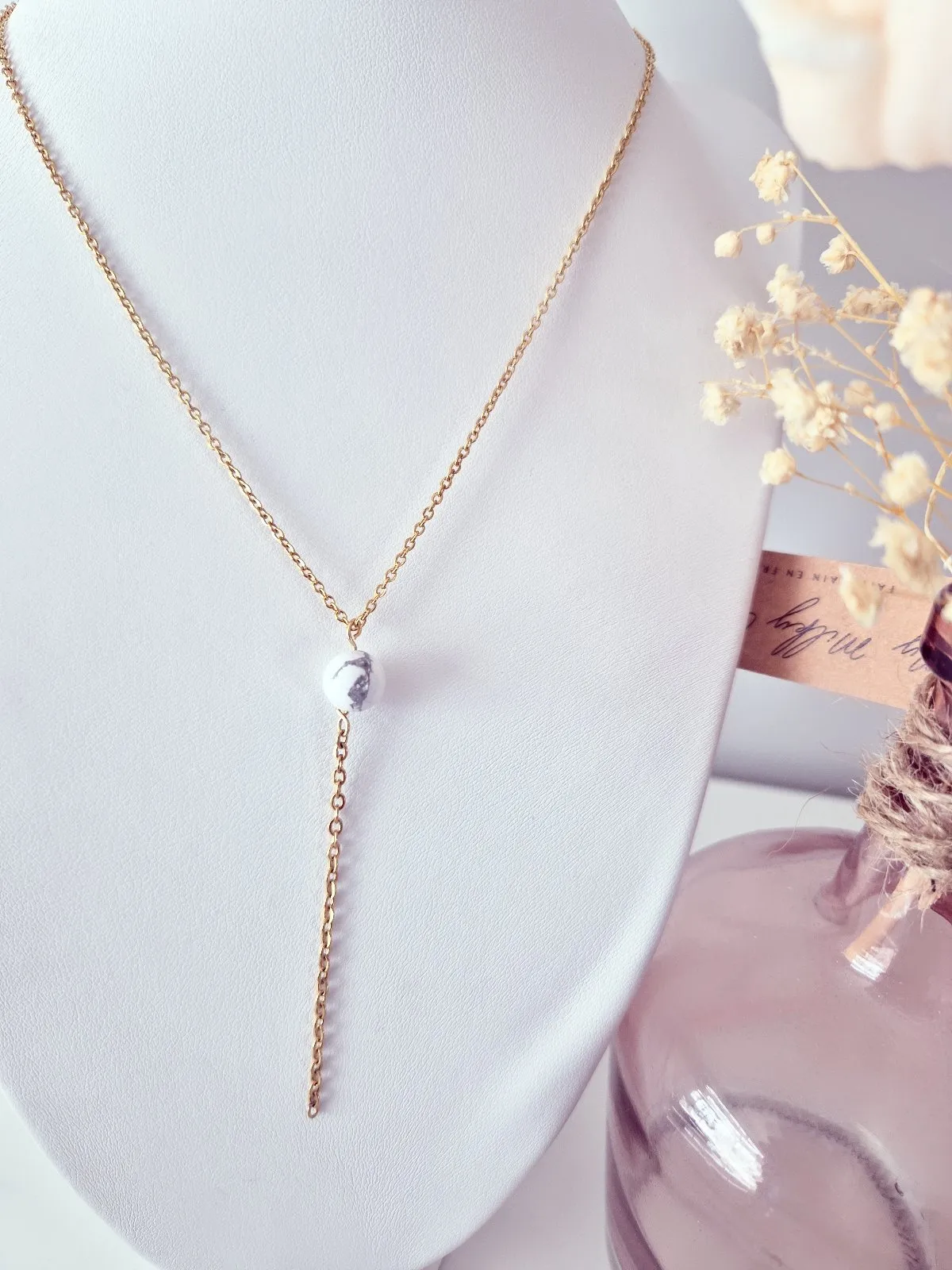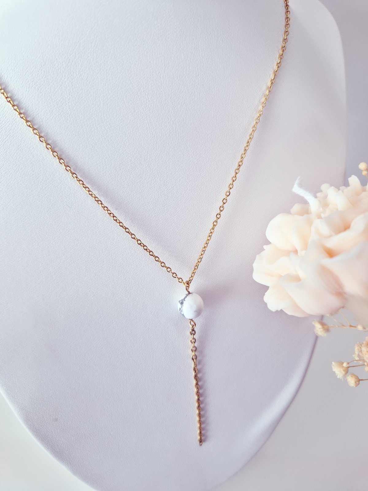 Ajoutez une touche d’élégance à votre look avec notre collier plongeant fait main. Chaque pièce est unique, ornée d’une perle naturelle howlite qui apporte une sensation de calme et de sérénité.