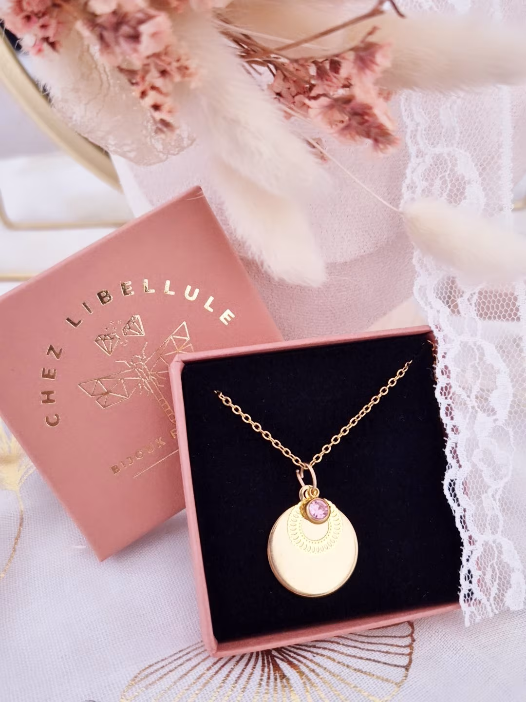 • Gravure : Vous pouvez choisir de graver un texte personnalisé sur la médaille. Prénom, date spéciale, mot d’amour ou citation : à vous de choisir ce qui rendra votre bijou unique !