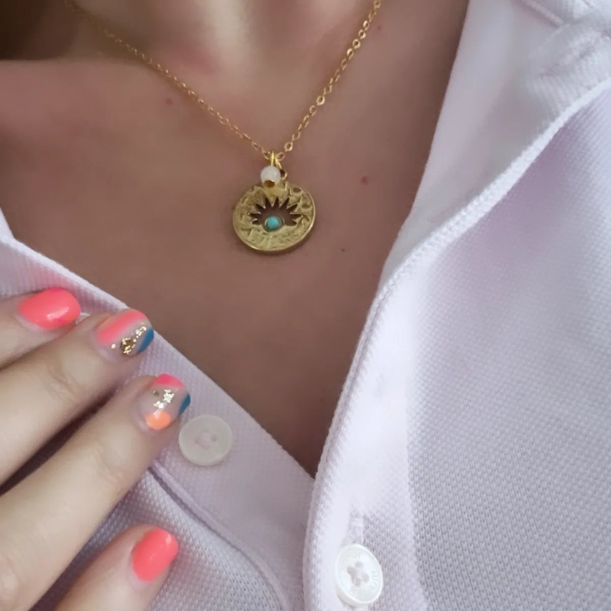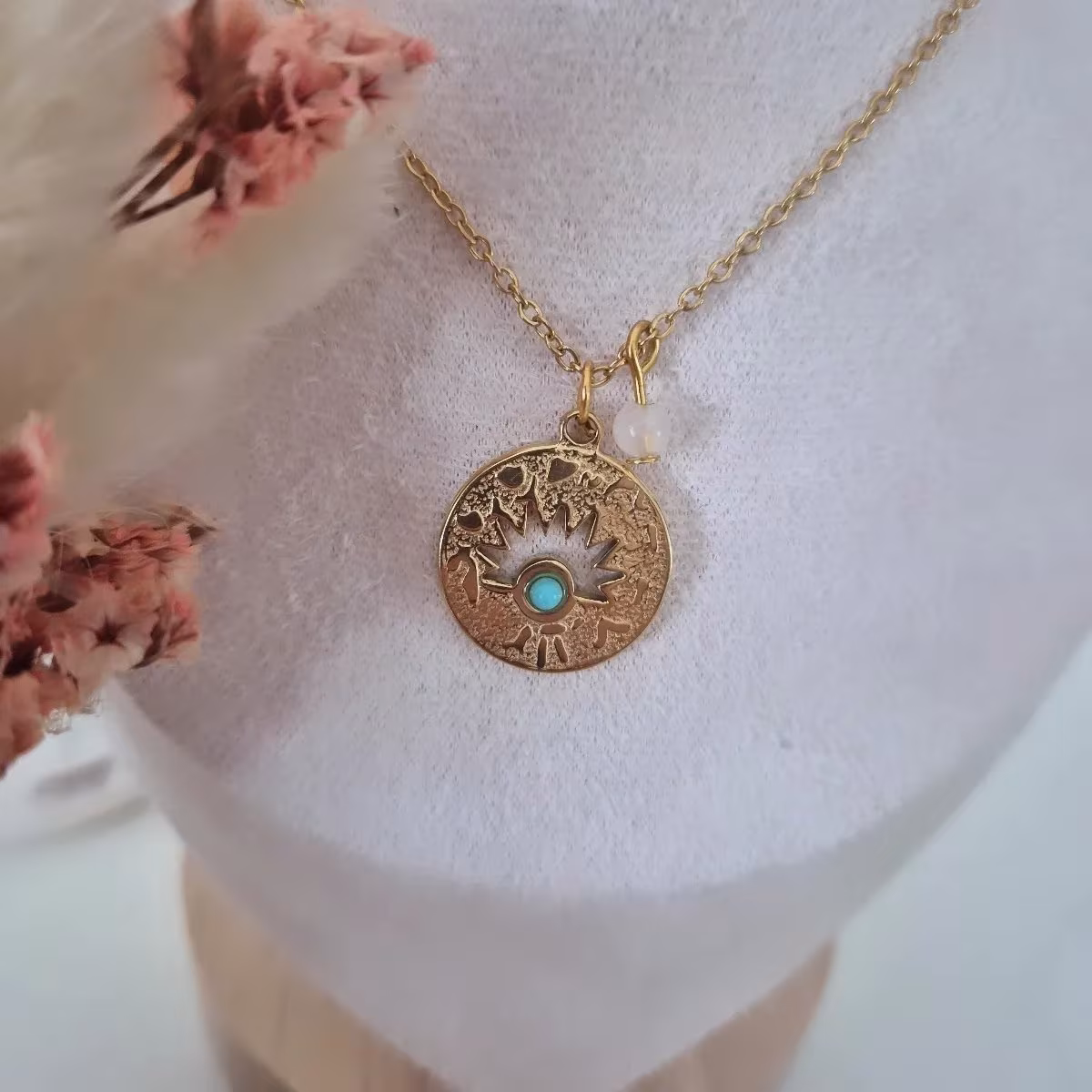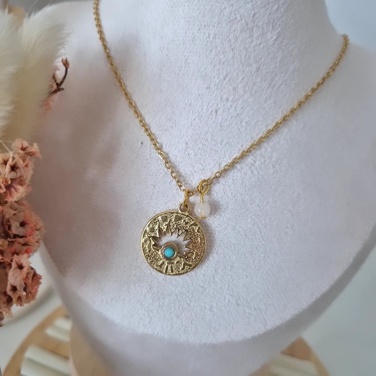 Découvrez notre collier unique « soleil » agrémenté d’un pendentif en forme de soleil avec un œil au centre, orné d’une pierre turquoise éclatante.