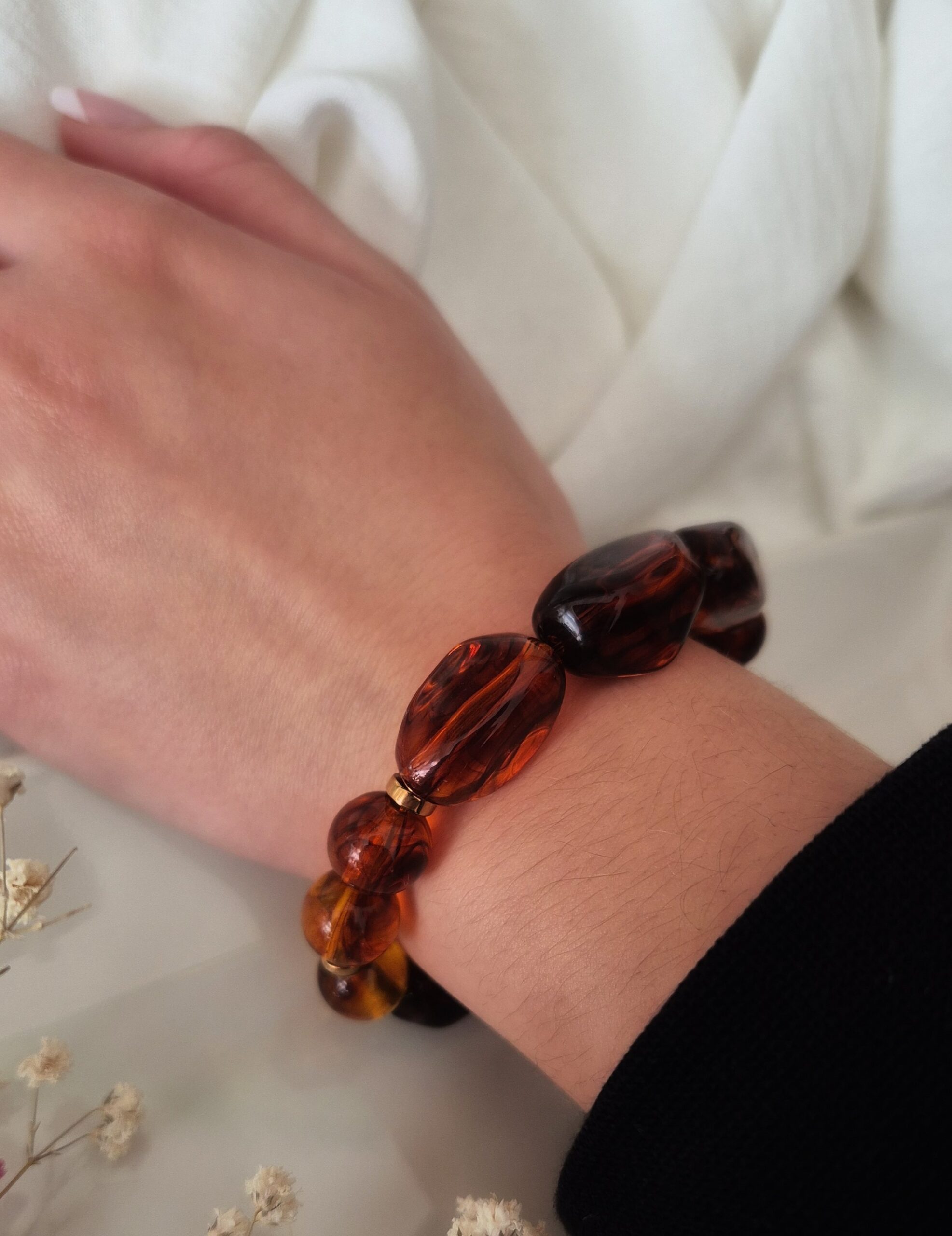 Matériaux : Perles en acrylique ambre et marron translucide, éléments dorés en métal