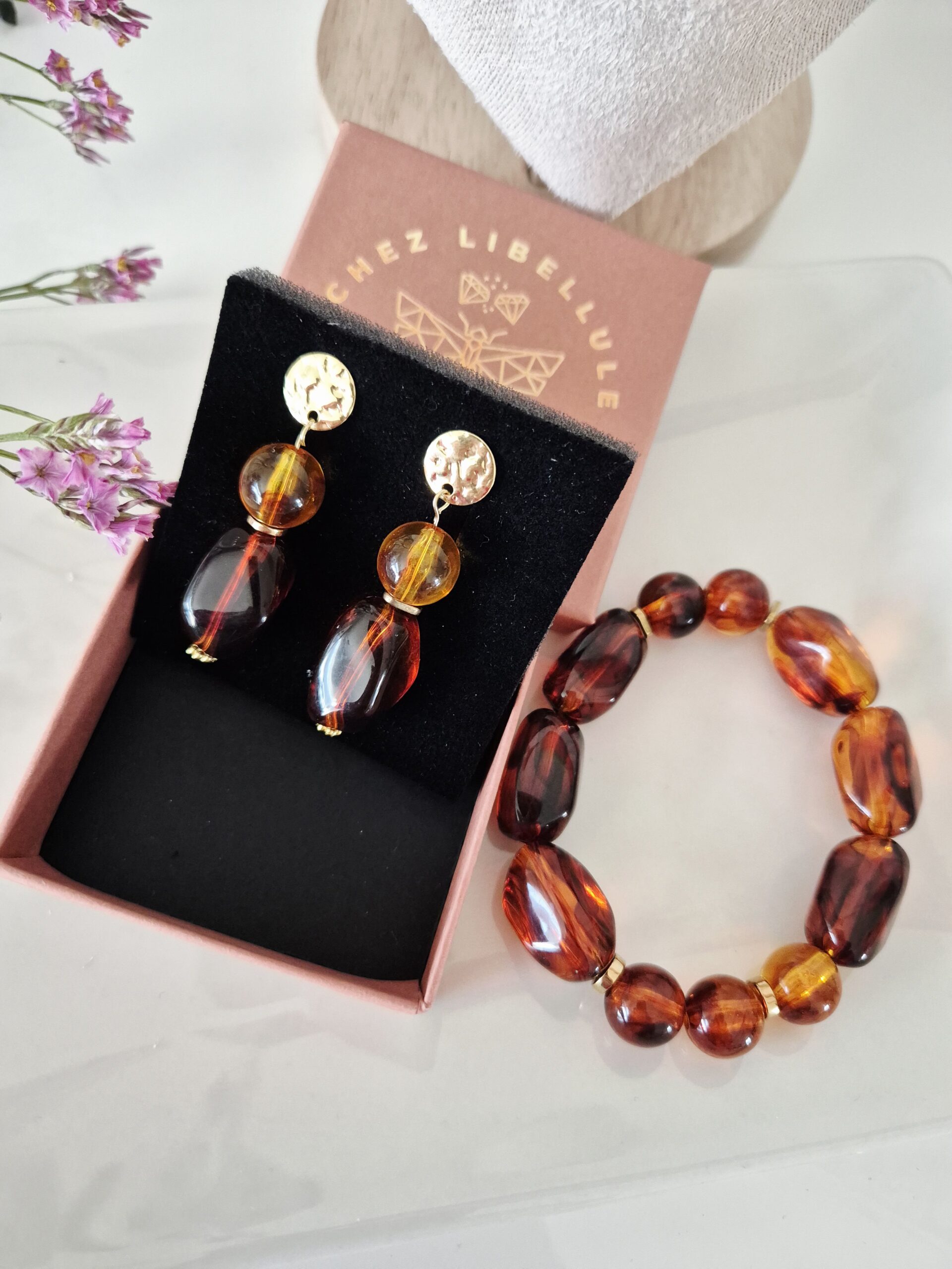 Ensemble Ambre Doré – Bracelet & Boucles d’Oreilles