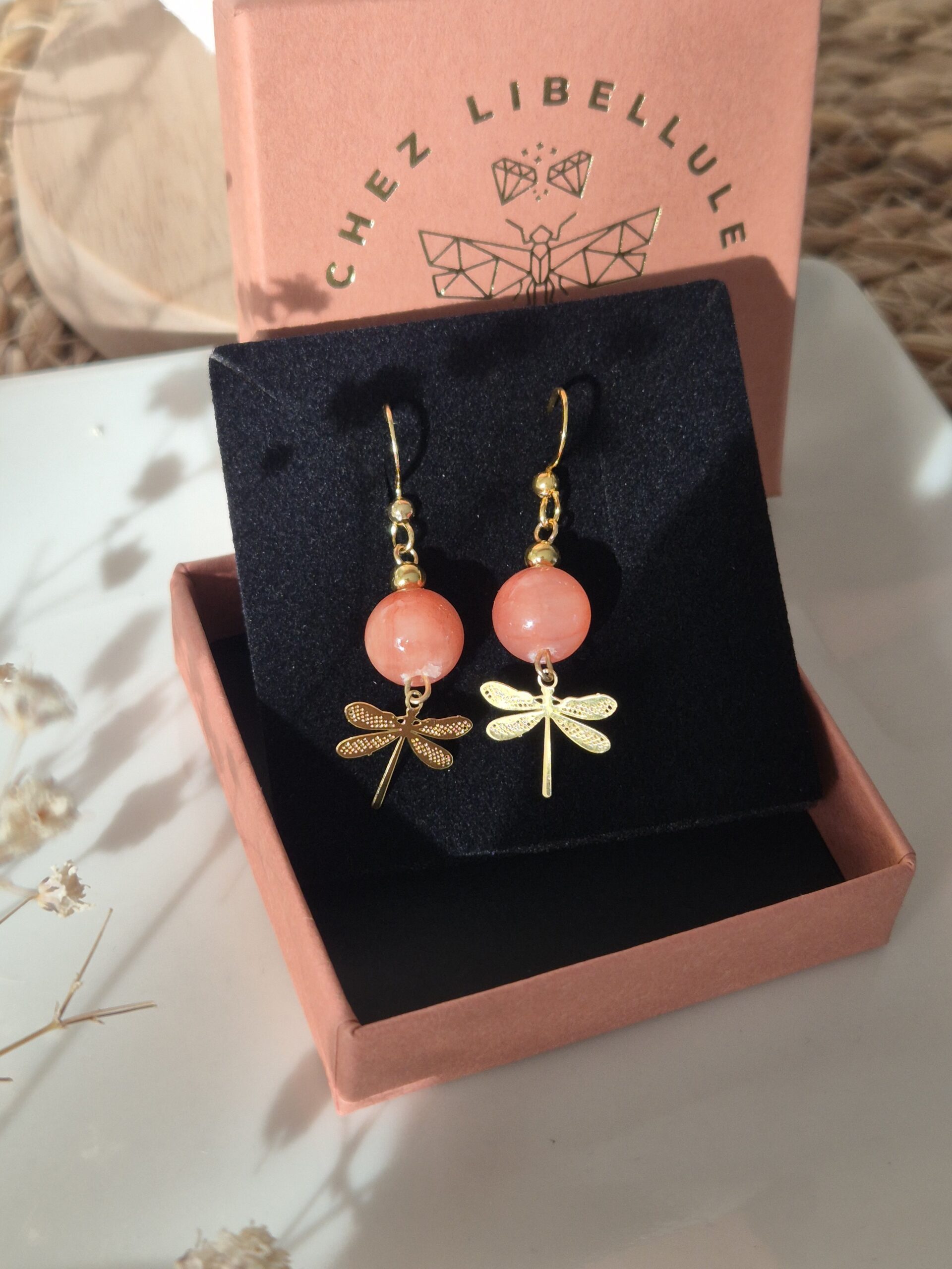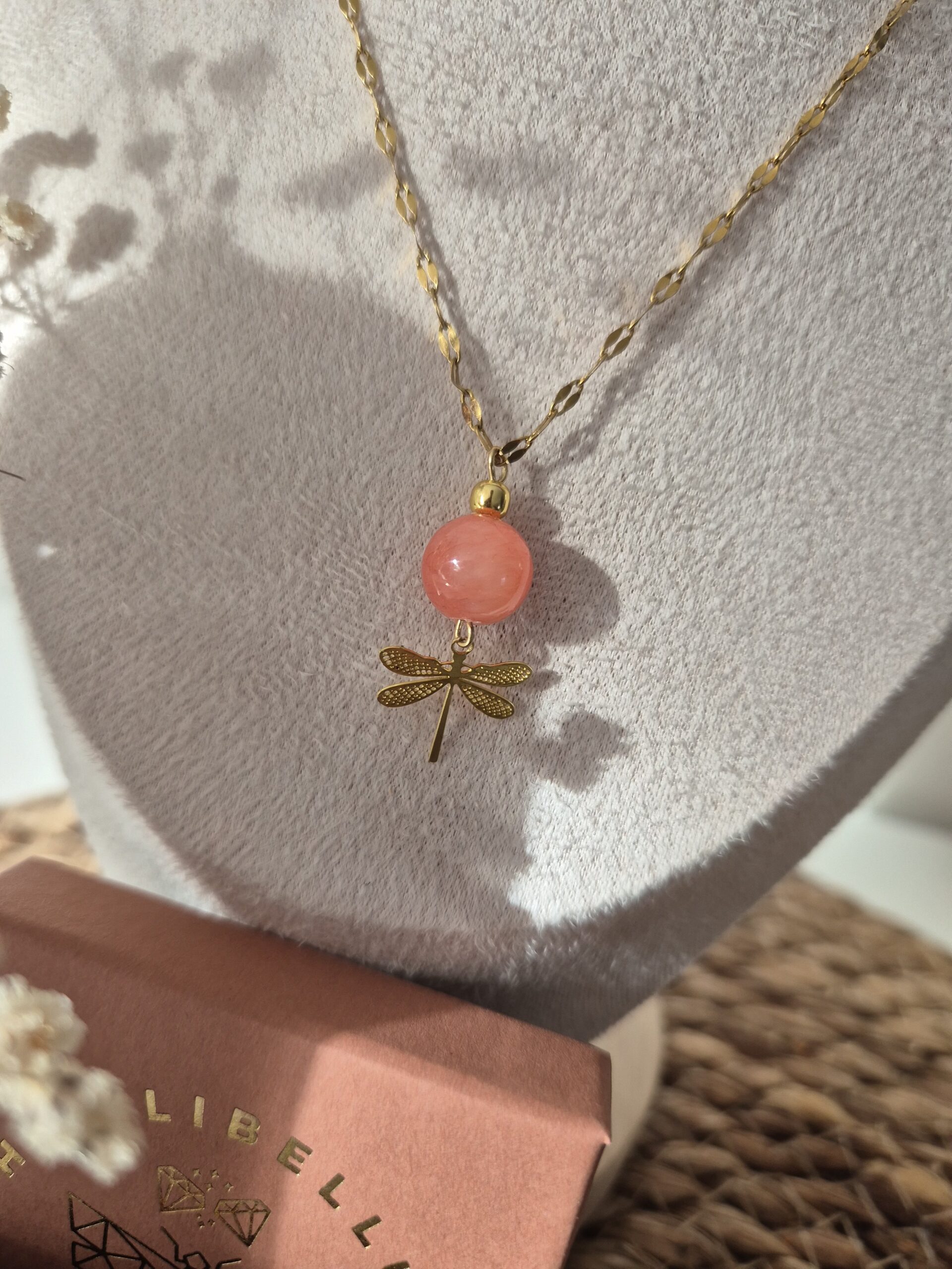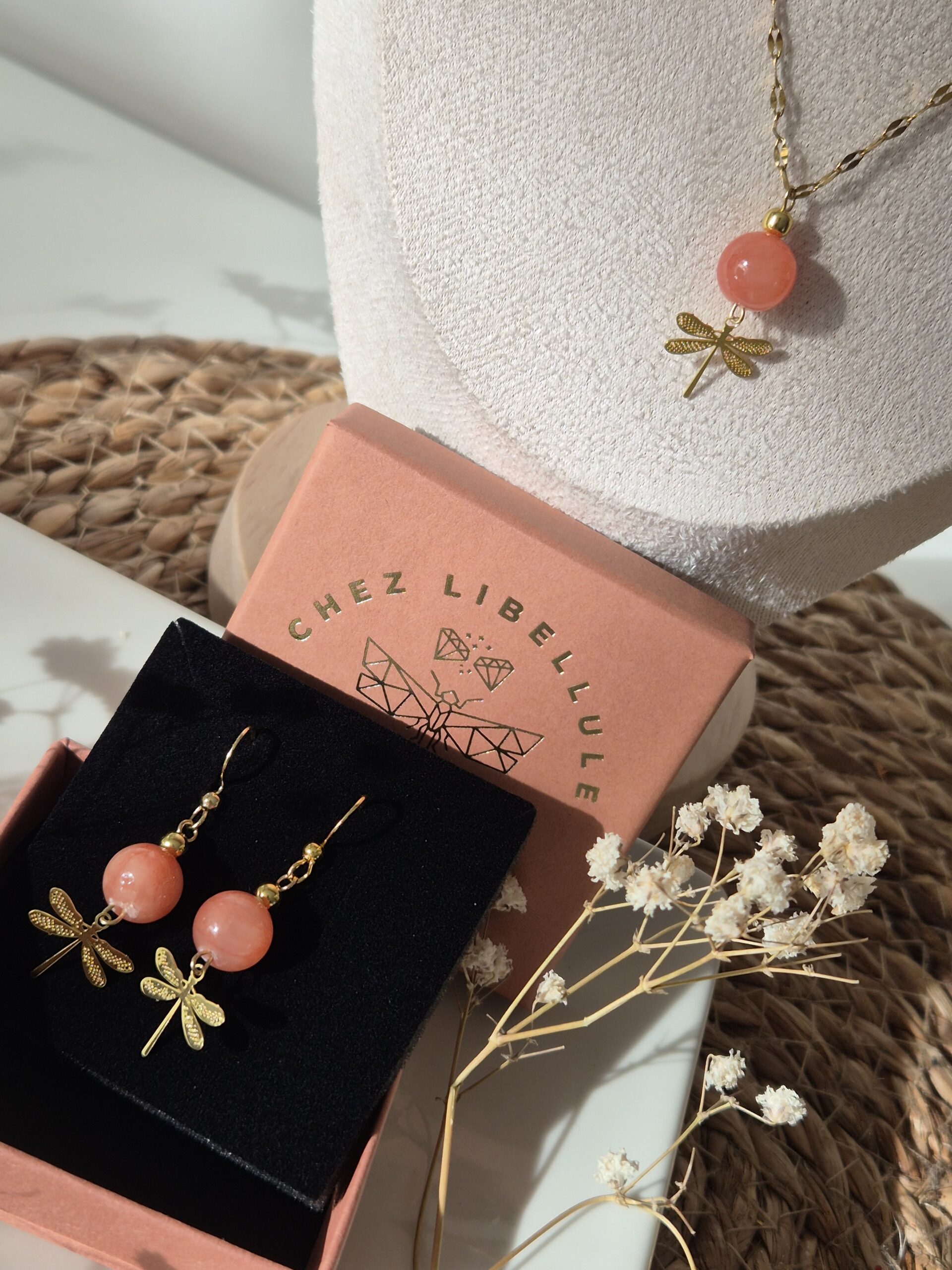 Découvrez cet ensemble poétique composé d’un collier et d’une paire de boucles d’oreilles en pierre naturelle de corail rose, sublimé par un délicat pendentif libellule doré.