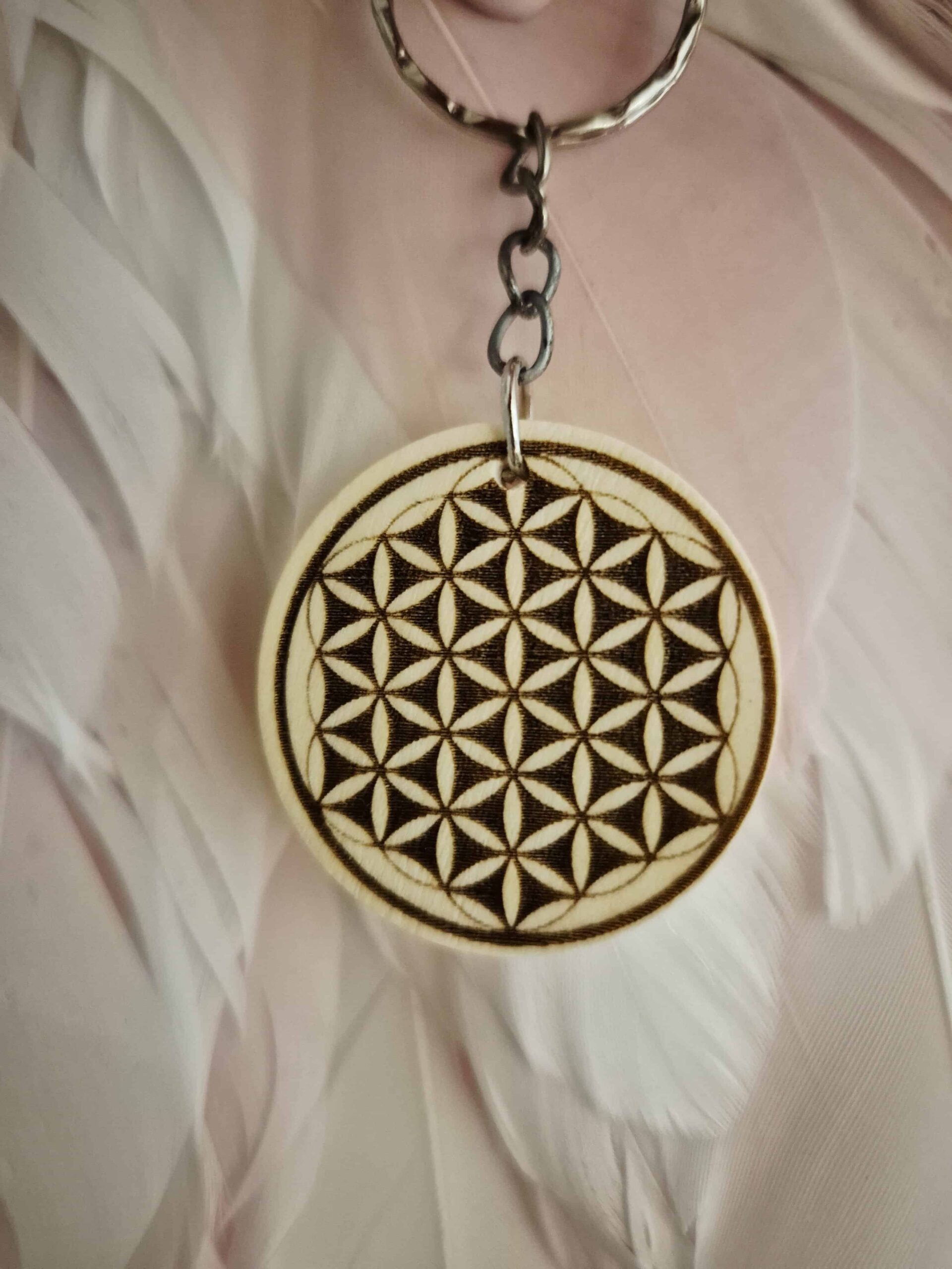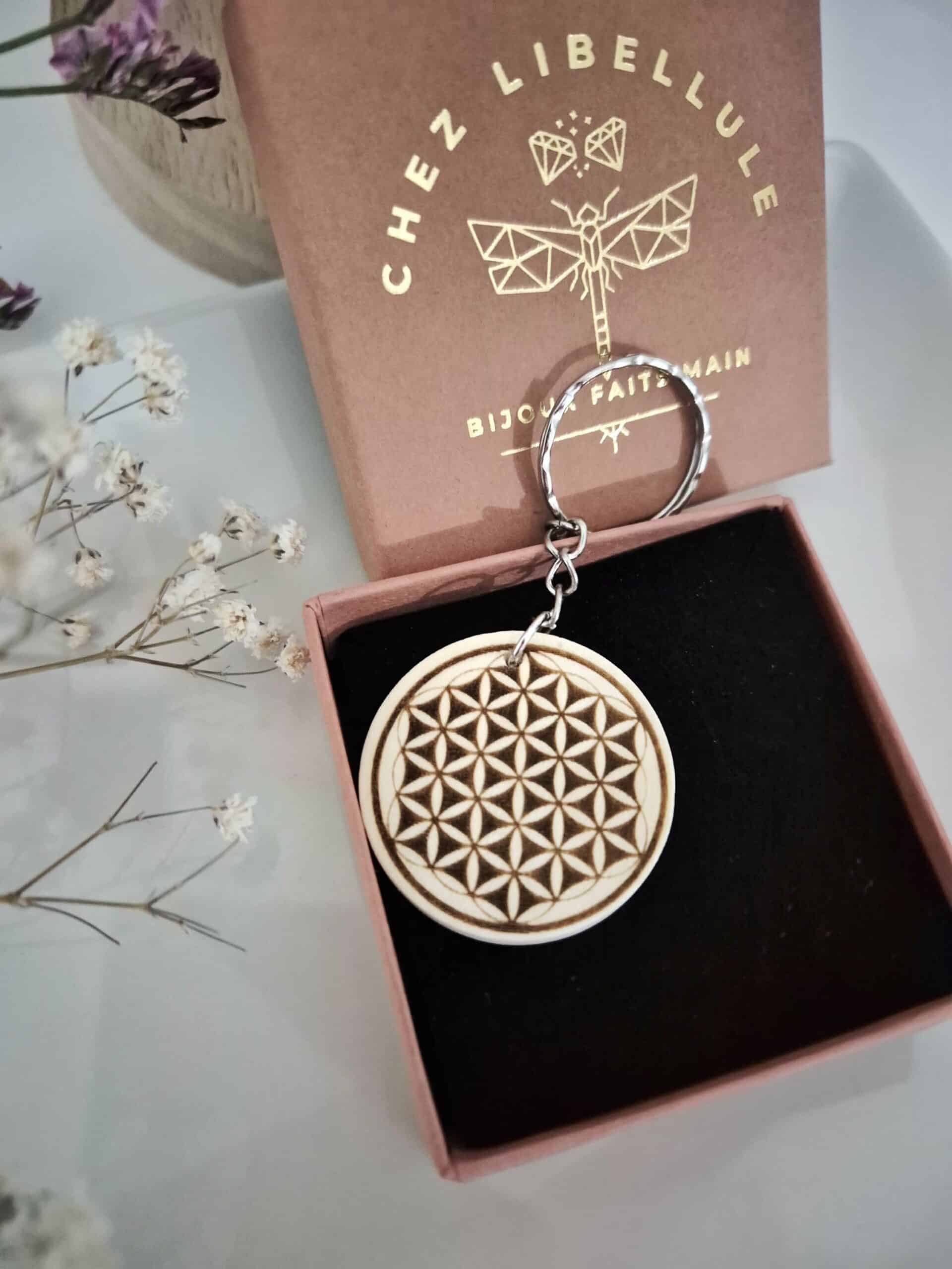 Ce porte-clés en bois est entièrement fait main, avec une gravure délicate de la Fleur de Vie, réalisée avec soin dans mon atelier.